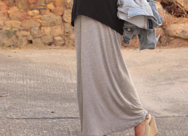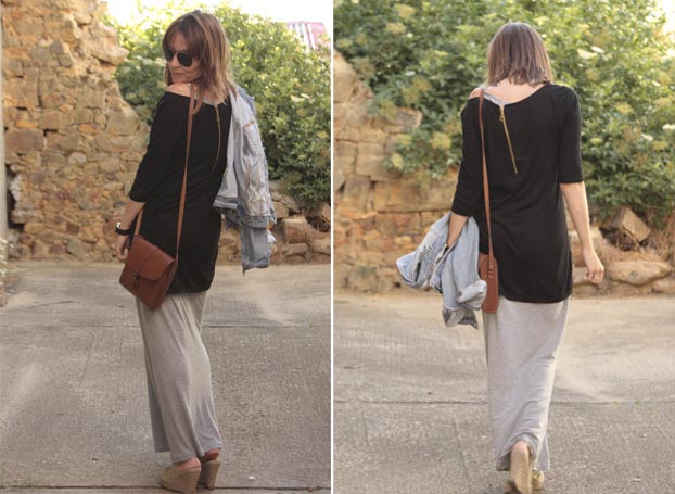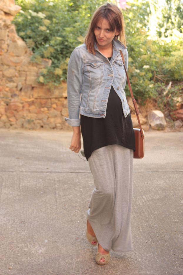 Parece que me he aficionado a ir vestida de largo, no estoy muy segura si es debido al tiempo que padecemos por estas tierras o tal vez por lo tremendamente cómodo que me resulta. El vestido que llevo ya me lo habéis visto varias veces, puesto de multitud de maneras: Como falda Midi, en la misma linea que lo llevo hoy para disimular la barriguilla post parto, creo que como no os lo he enseñado nunca es en solitario. Hoy lo he combinado con camiseta larguita y asimétrica con cremallera a la espalda en negro, cazadora vaquera y las cuñas y el bolso que últimamente no me quito.