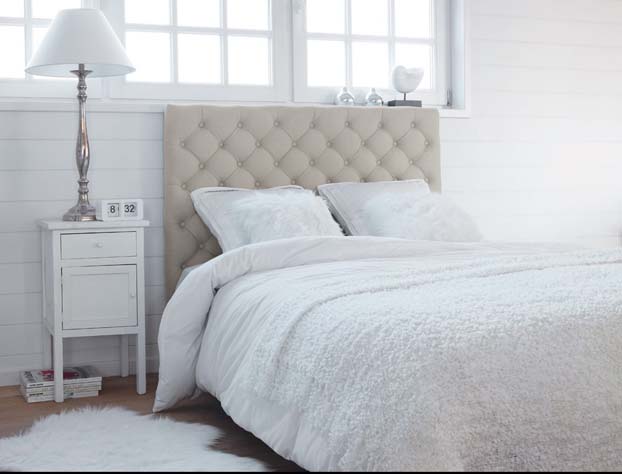Hace poco hemos puesto el cabecero de nuestra habitación y nos decidimos por el capitoné sin botones, con cuadrados muy grandes y en blanco roto. Lo hicimos en El Corte Inglés, ya que se adaptan a lo que buscas en formas y materiales con bastante variedad (en capitoné) y muy bien de precio. La ropa de cama la cogí toda en Zara Home.