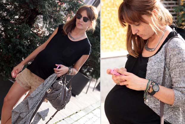 Como mi barriguita ya es una barriga de 9 meses en condiciones (mirad la diferencia entre las fotos de frente o de perfil) en esta ocasión opté por hacerme un peinado inspirado en las propuestas que os he hecho últimamente e incorporarle algunos complementos que me dieran un punto mas roquera para suavizar mi imagen de súper pre-mamá que me acompaña y que no todos los días me apetece. ¿Os gusta el resultado?