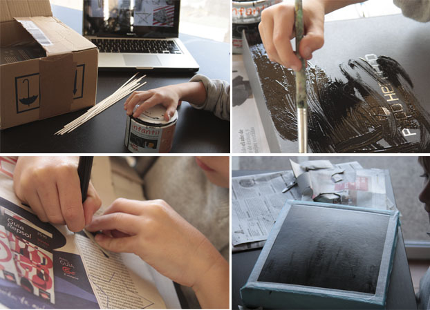 Materiales: Papel de periódico, la tapa de una caja de zapatos, pintura de pizarra, papel de cebolla, masking Tape, Baker Twine , palillos, tijeras, boli, pegamento y tiza.