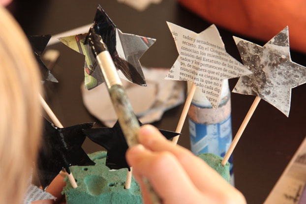 Empezamos haciendo un molde de una estrella por el que sacar las demás, con ese molde sacamos otras sobre el papel de periódico. Las recortamos y las pegamos de dos en dos a los palillos con ayuda de un trocito de masking tape y el pegamento. Algunas las pintamos con pintura de pizarra y otras las dejamos tal cual.