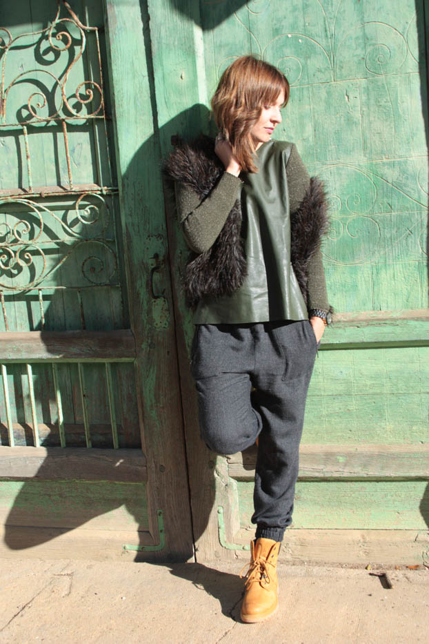 Mi look para esta Navidad contrastando tejidos una vez mas, en este caso en tonos gris y verde: Pelo, piel, punto… Cambiadme las botas de campo por unos botines de tacón negro y transformaremos un cómodo look de campo en uno mas urbano.