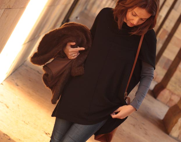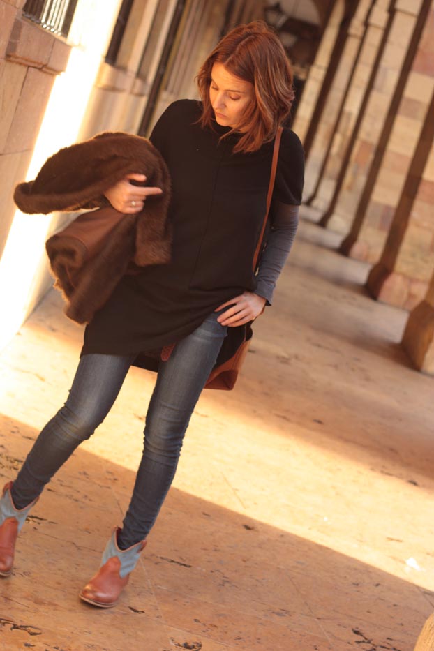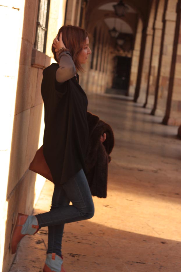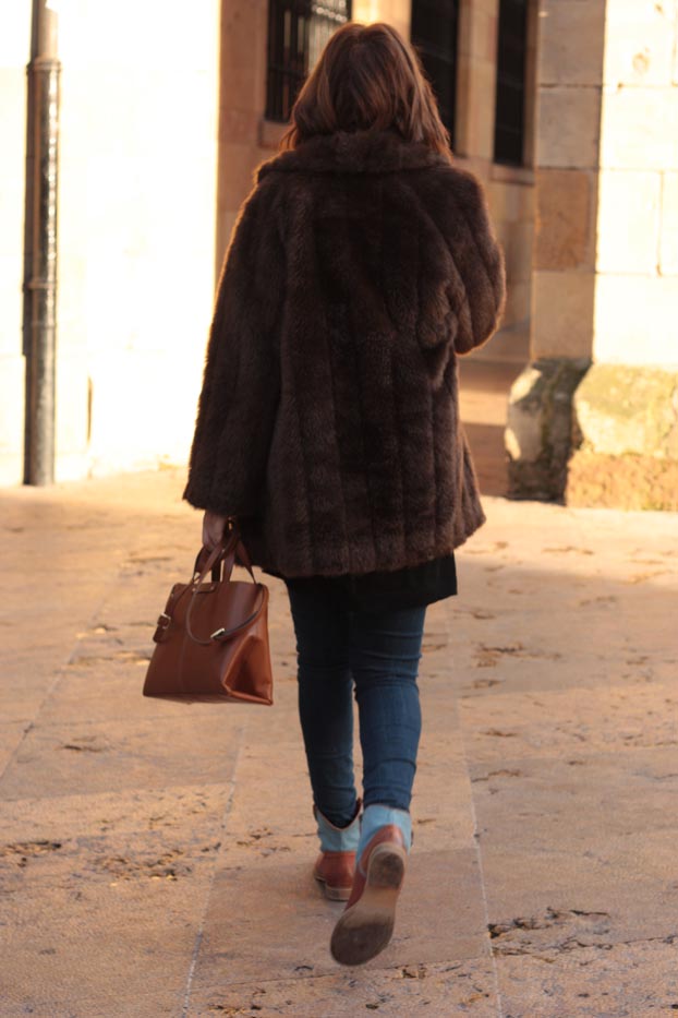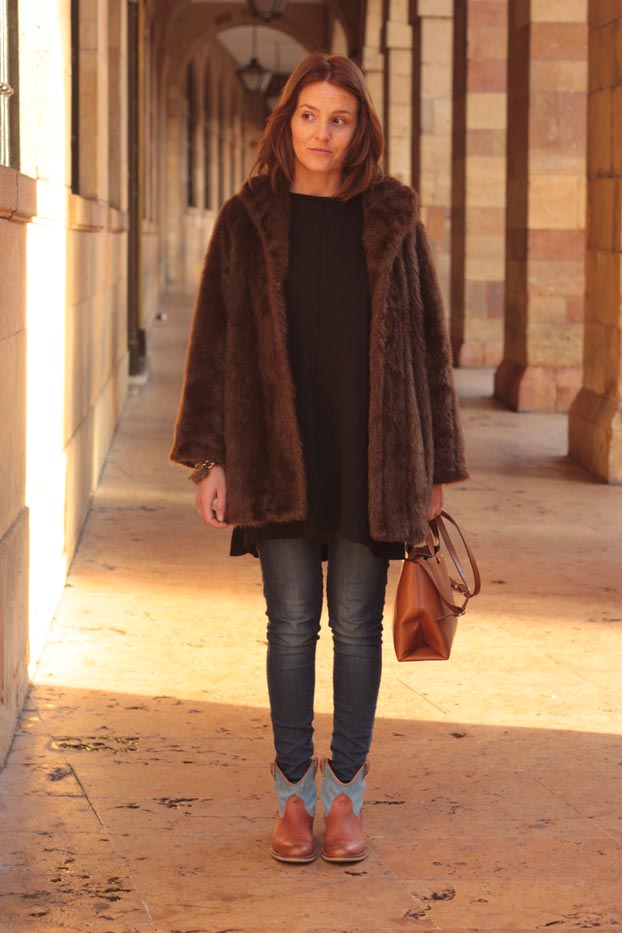 Abrigo de pelo Vintage, jersey y bolso Zara, jeggings C&A, Botas It Shoes, pulsera Bimba y Lola.