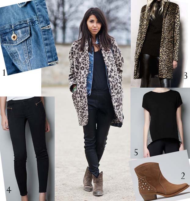 Volvemos a la carga con uno de nuestros Consigue el look… La premisa para elegir el look de hoy, era buscar un estilismo compuesto por prendas tan normales que todas las tengamos ya en nuestro armario: cazadora vaquera, pantalón y camiseta negra, botas camperas y abrigo de pelo (en este caso versión Leopardo) Combinándolas mirad que look mas chulo ¿No os encanta?