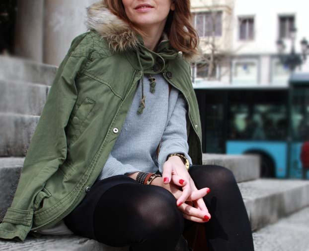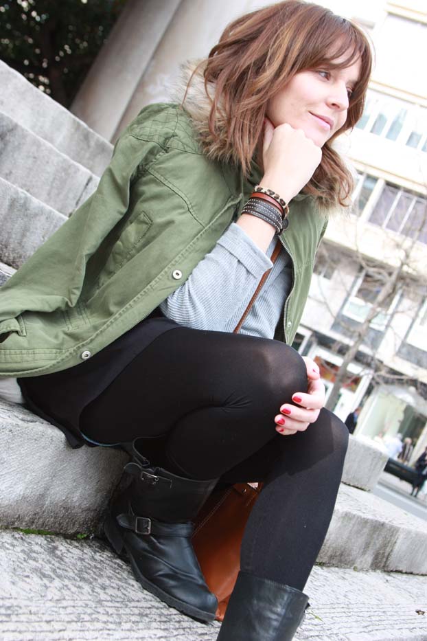 Parka Pull and Bear, Vestido H&M, Sudadera Zara, Botas Venca, Bolso Zara, Pulseras Massimo Dutti, reloj Uterqüe.