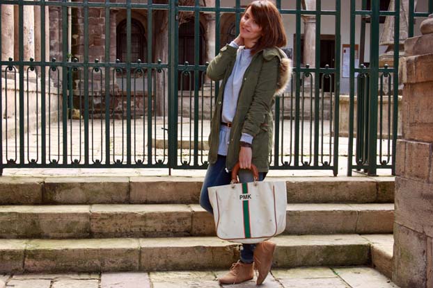 El bolso es de una firma Italia Pomikaki que te da la opción de poder personalizarlo incluyendo tus iniciales. El resto del look vaqueros y parka que por aquí aún hace frío.