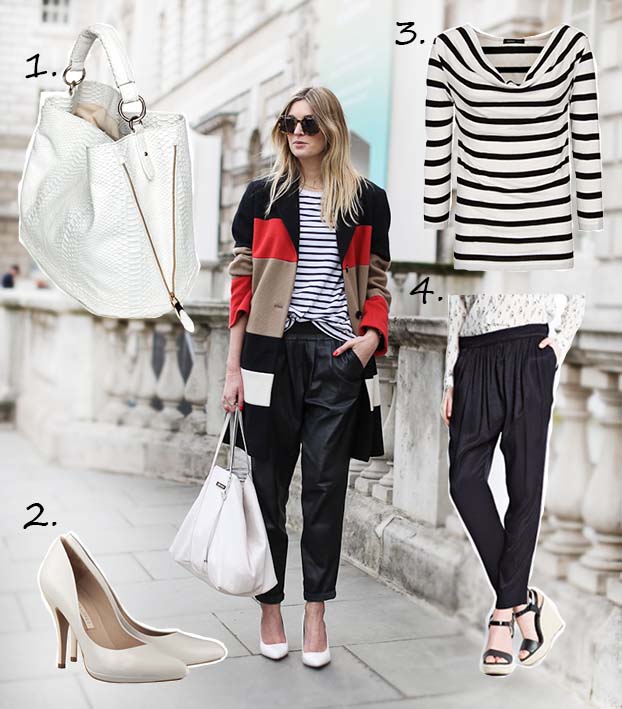 Esta semana os traemos otro de nuestros consigue el look esta vez combinando varias tendencias; camiseta marinera, pantalón baggy y zapatos blancos. Un look con colores de la temporada y con un punto primaveral. No habíamos elegido chaqueta porque a estas alturas pensábamos que habría llegado la hora de guardarlas hasta el otoño. De todas formas, si vosotras también estáis sufriendo el temporal o para las zonas más fresquitas de nuestro país podemos optar por una blazer o una biker.