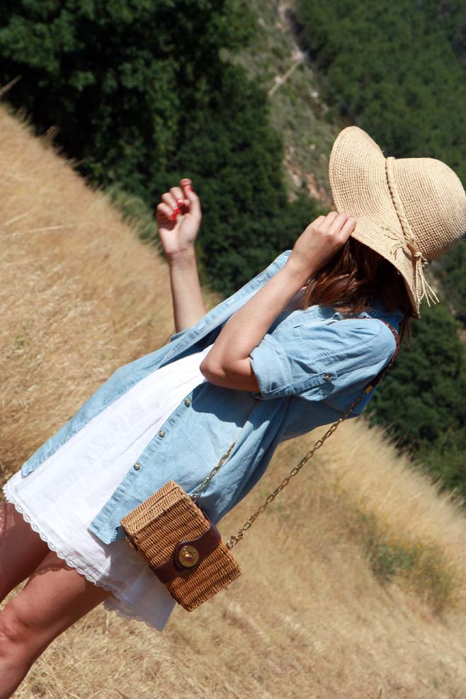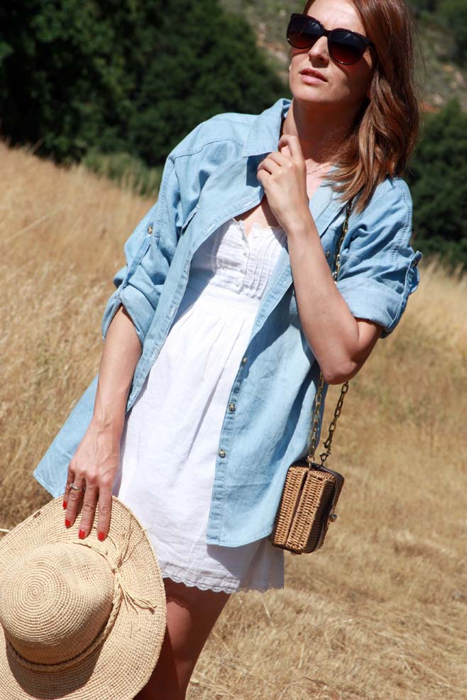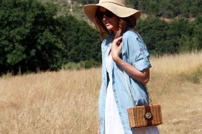 Ya me encuentro desde hace un par de dias en mi segundo destino vacacional, en tierras leonesas y de camino al río una parada rápida para sacar unas fotos y enseñaros uno de mis looks habituales este verano: vestido blanco con camisa vaquera y pamela. Este año mi objetivo es no llevar conmigo para el invierno ni una sola mancha solar y para eso ya nos contó Estela que la pamela era un elemento fundamental.