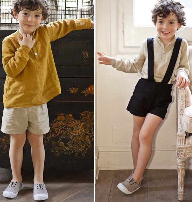 Para niños, las camisas de cuello mao y tejidos naturales creo que son perfectas combinadas con bermuda con tirantes, pantalones cortos o con tipo chinos que tenga una buena caída.