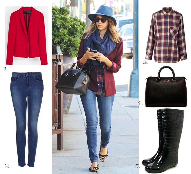 Hoy os proponemos un look para un día lluvioso pero sin perder nada de estilo, Jessica Alba lo luce con unas bailarinas pero para la lluvia, hemos añadido unas botas con efecto cocodrilo. Las demás prendas muy básicas: vaqueros, camisa de cuadros y americana burdeos. Para darle el toque final un sombrero y una buena bufanda.