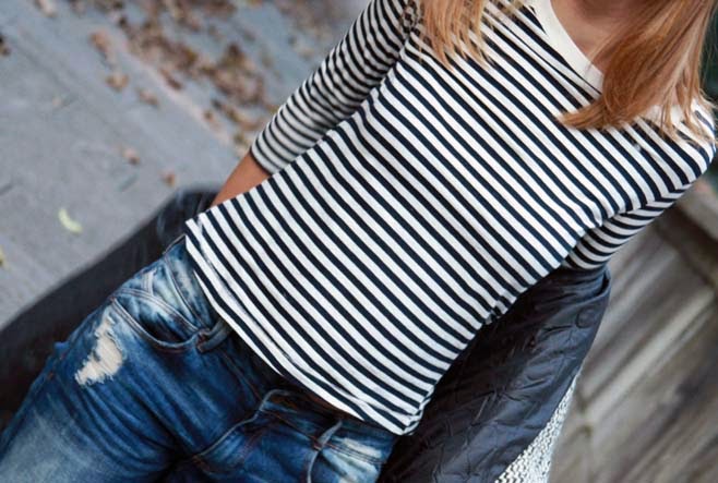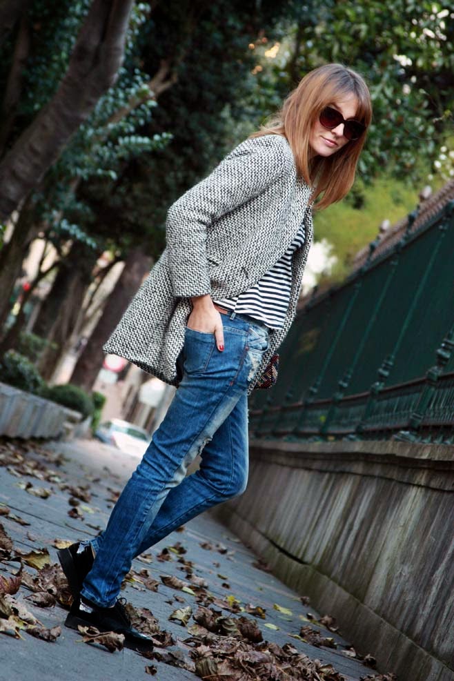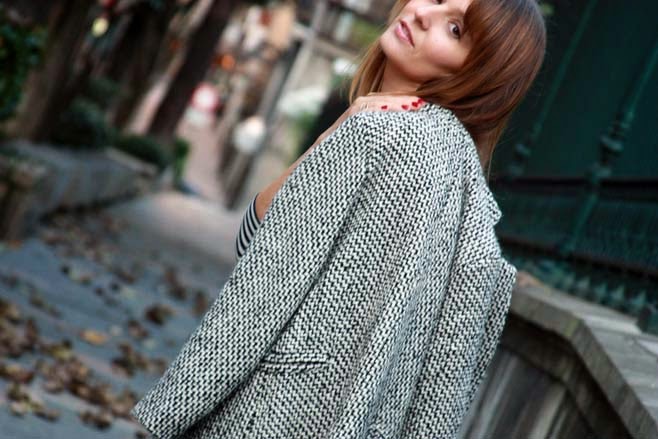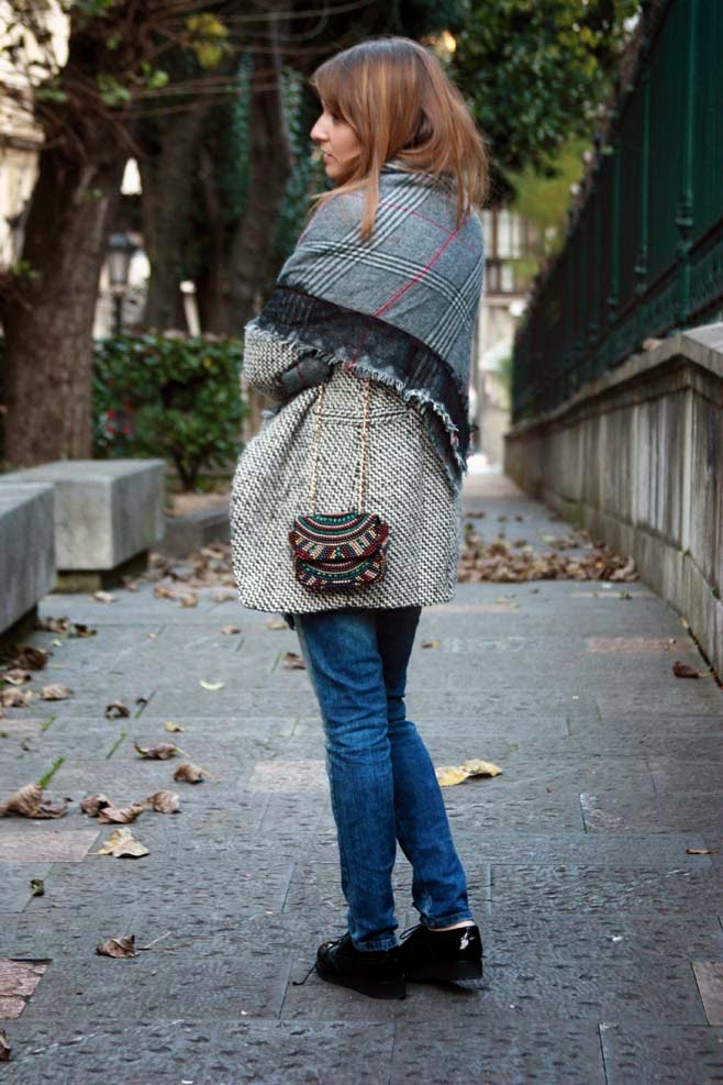En el look de hoy, con base en blanco en negro, he combinado una camiseta de rayas marineras, abrigo con dibujo geométrico en los mismos tonos y sobre todo esto para estar calentita la manta que ha llegado a mi armario como por arte de magia -bueno, mas bien la magia la hizo aquel post donde os animaba a usar mantas sobre todo–