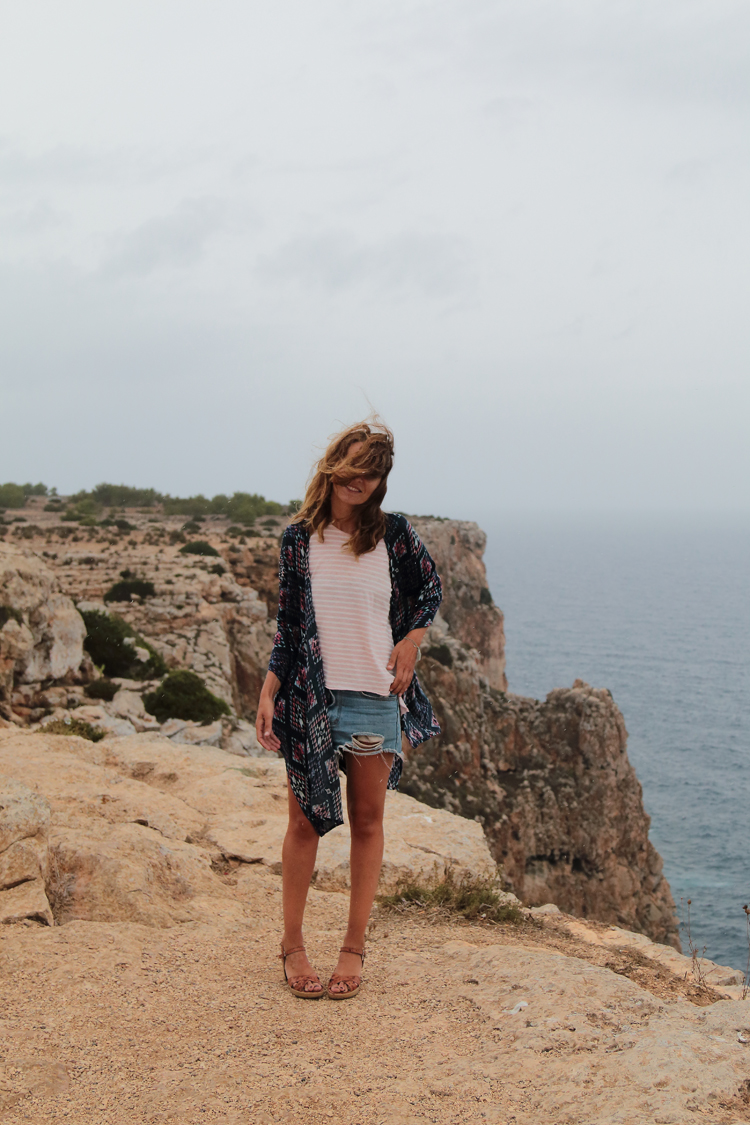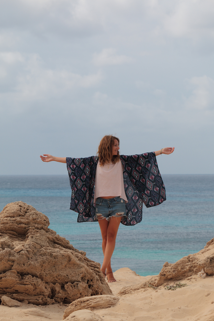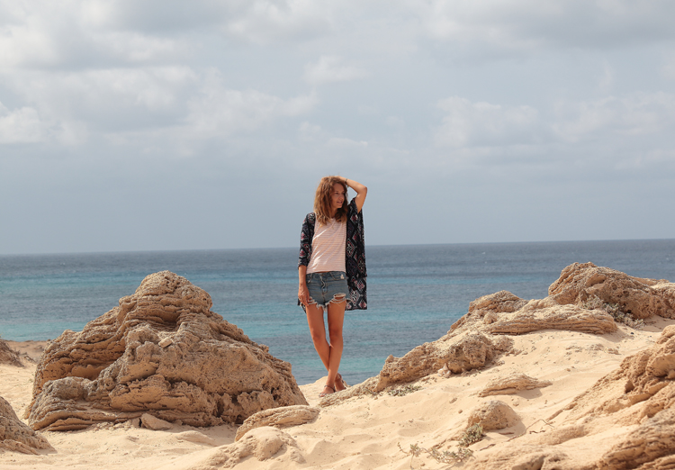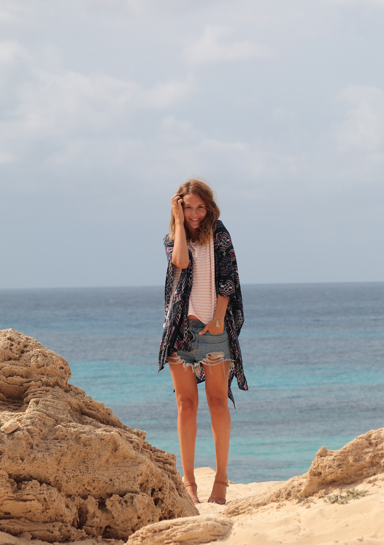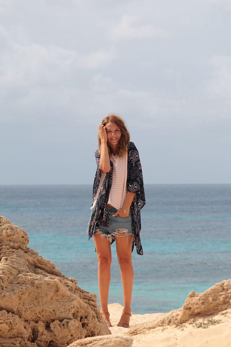 Este look es de uno de esos días, con el pelo al viento como te enseñaba en Instagram, con mi kimono de verano favorito y con las ondas surferas que el agua del mar me deja sin ni siquiera pedírselo seguramente es un premio por las horas que le dedico.