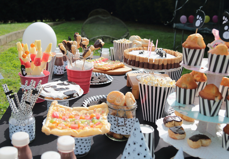 Con el oso panda como protagonista los colores tenían que ser el blanco y el negro, pero para que la mesa no quedara demasiado monótona también le incluí algún tono rosa. En esta ocasión tuvimos la gran suerte de contar con Nice Party que me ayudó con algunos de los elementos decorativos protagonistas, como la preciosa lámina personalizada de oso panda que ahora está colocada en la habitación de Chloe, la banderola con el mensaje ¡Party!, los gorritos de los niños y las botellas y banderitas que aparecen sobre la mesa y la comida.