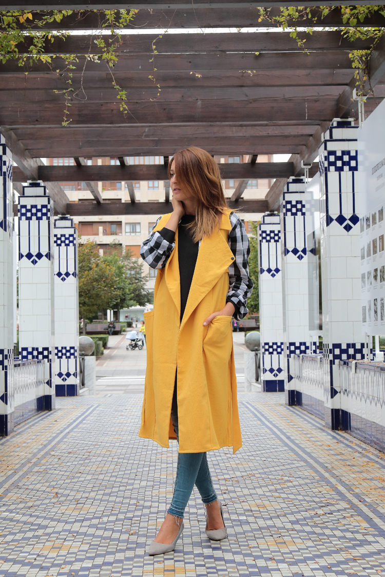 Vestido de terciopelo, Chaleco Amarillo, Bolso mostaza, jersey negro, Falda roja, jersey pompones camisa cuadros vestido babydoll cazadora de ante