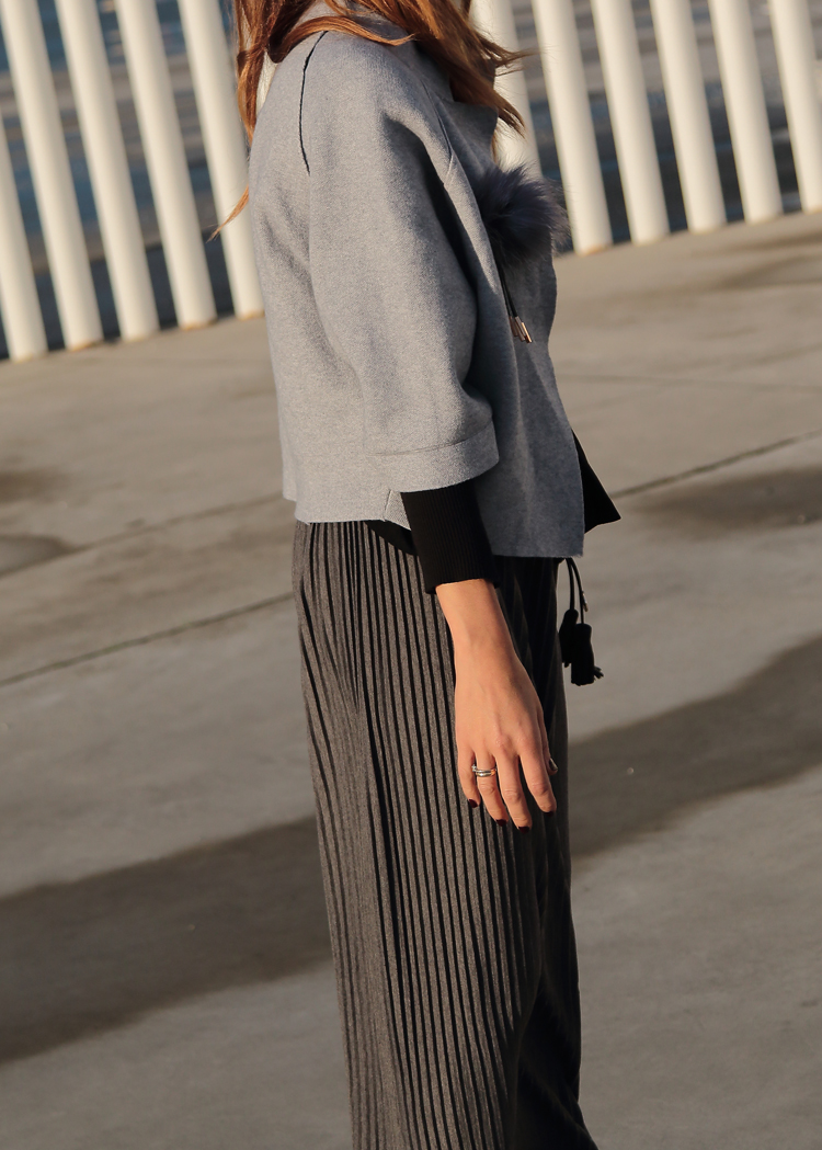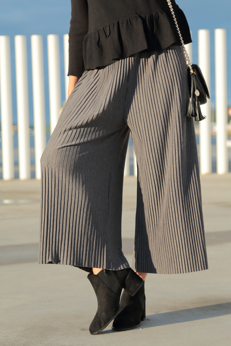 Los tonos oscuros se han apoderado de mi este otoño a juzgar por mis últimos looks Hoy la combinación negro-gris es la protagonista, una combinación clásica que nos puede servir como hilo conductor para mezclar prendas de diferentes estilos como este plantalón plisado que ya te enseñaba la primavera pasada y el jersey de volante.