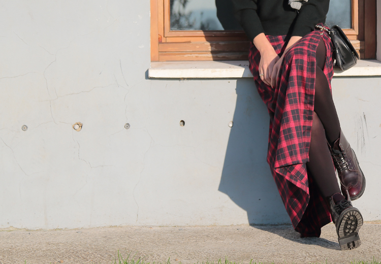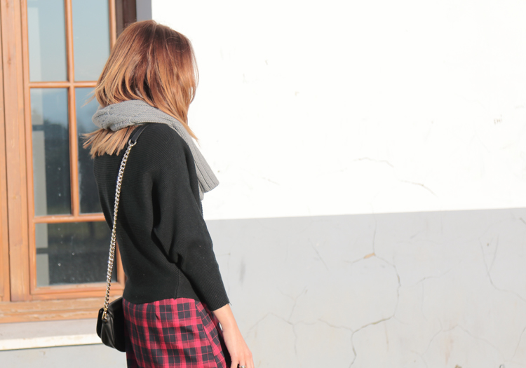 Como puedes ver para combinarla he seguido la linea cromática de la falda combinándola con jersey negro y botas de color granate. ¡Espero que os guste! ¡Feliz martes!