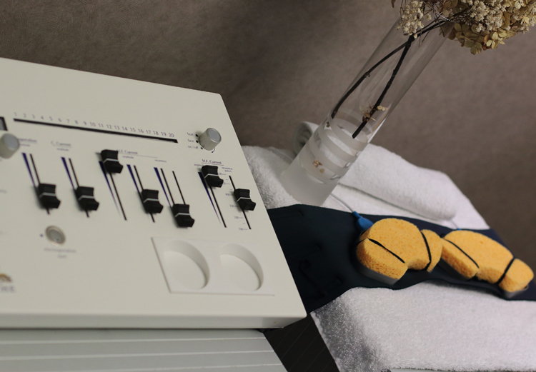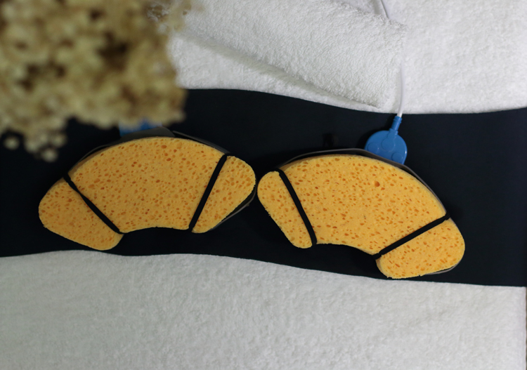 Este tratamiento está especialmente recomendado para la piel madura, para pieles jóvenes con tendencia a la flacidez y rostros con las mejillas hundidas. Como puedes ver en la siguiente imagen consta de dos partes, la máquina que ves a la izquierda está conectada a las esponajas de la derecha que es lo que se coloca en la zona a tratar, sujetándolas con una banda elástica.