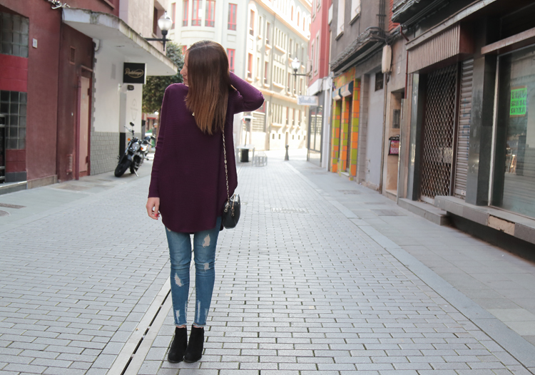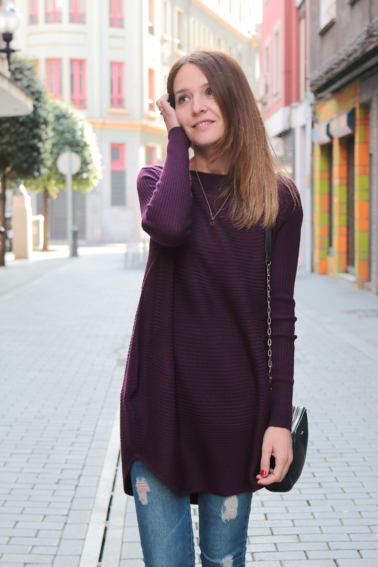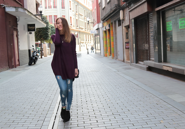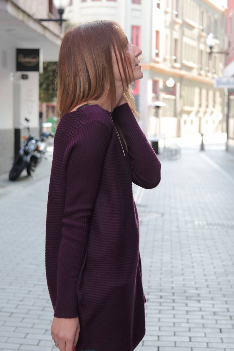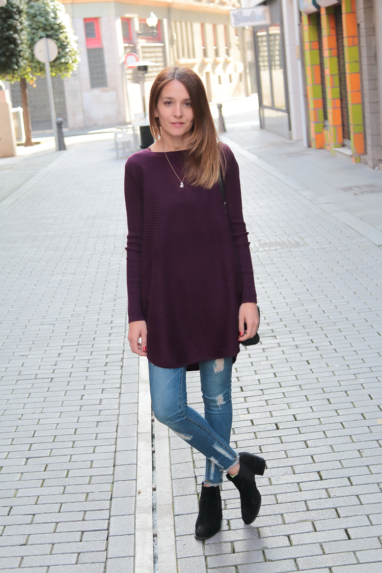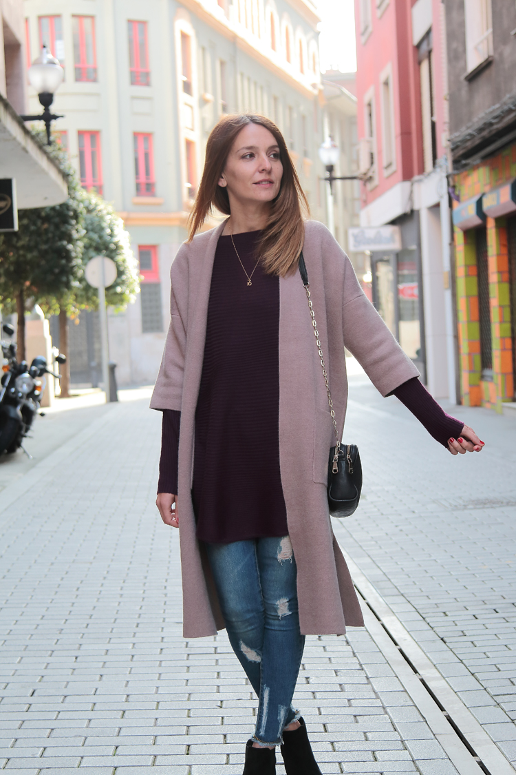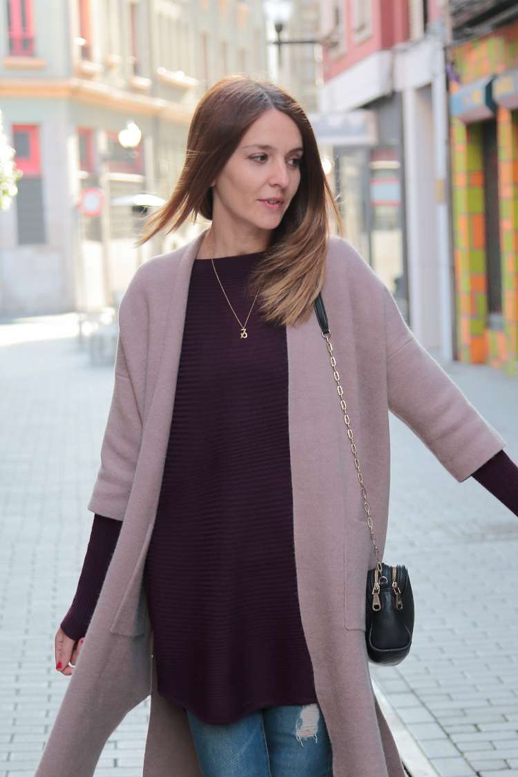 Lo he combinado con abrigo en tono rosa empolvado que como ves lleva la manga tres cuartos, vaqueros y botines negros. Es el tipo de look con el que yo «me siento muy yo» como se suele decir. Uno de esos que pasa de ser look del blog a uniforme semanal.