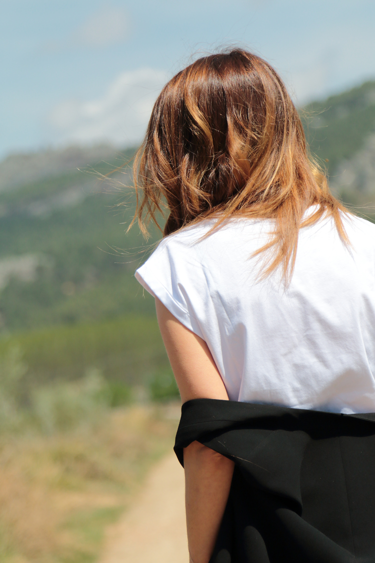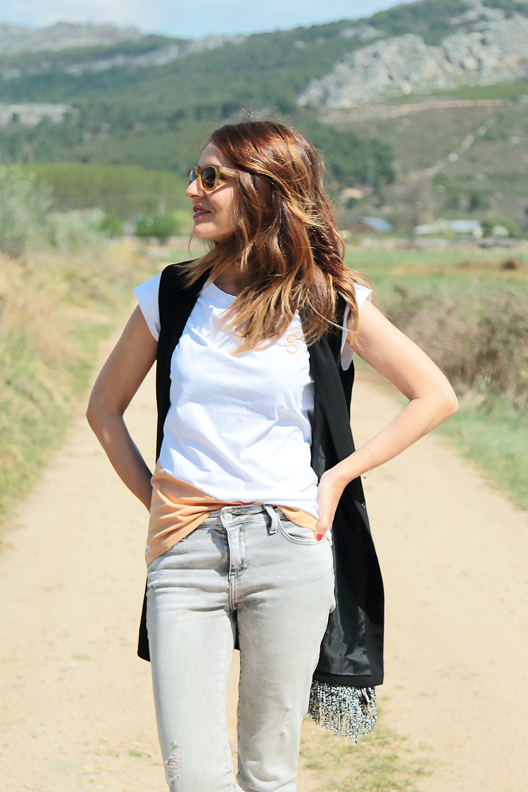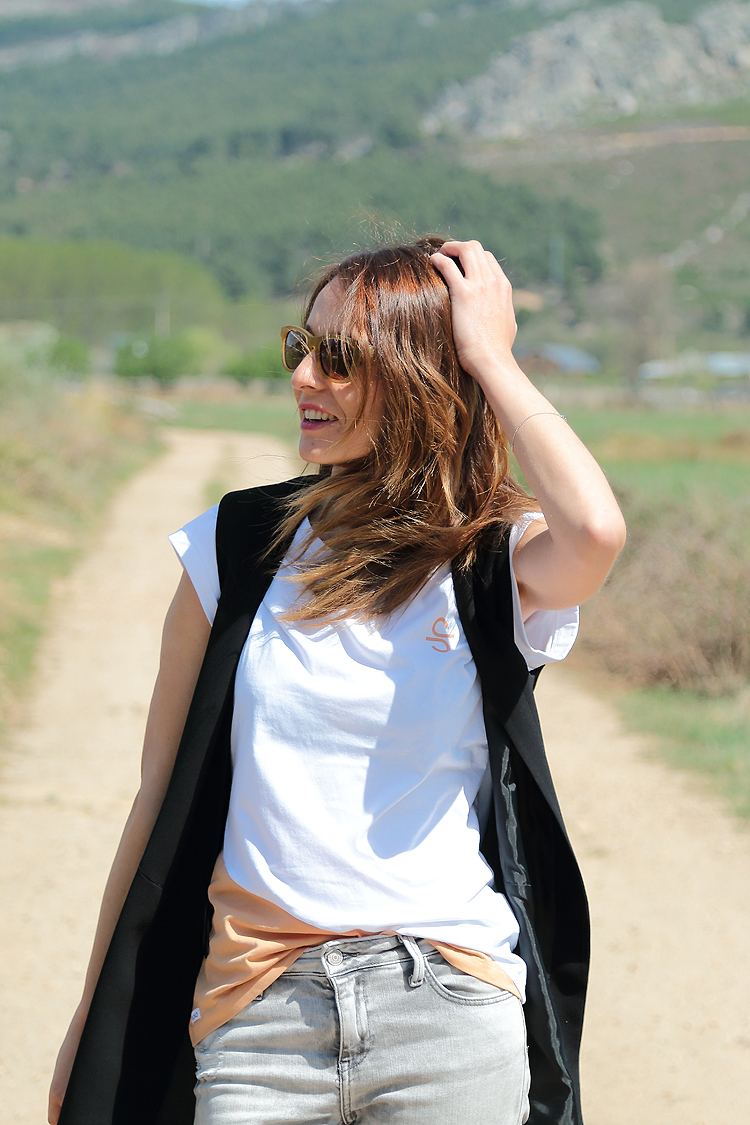 Me gusta la combinación camiseta mas chaleco creo que estiliza un montón y además es un look de transición perfecto para esta época del año. Hoy he utilizado el chaleco largo que te he enseñado en más de una ocasión y una camiseta de manga corta de la marca Siroko con las mangas ligeramente disparadas. Me gusta un montón precisamente por la forma de las mangas, por la combinación de colores y porque tiene un algodón súper agradable, si te gusta que sepas ahora la encontrarás muy rebajada.