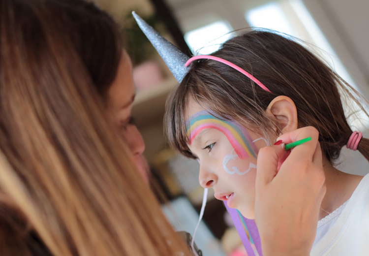 En cuanto a las actividades, el pinta caras es una de las cosas que mas les gusta a nuestros pequeños invitados. Seguimos utilizando el maquillaje de Imaginarium ya que para mi es de los mas sencillos que he probado. Además este año queríamos que todo el mundo fuera de unicornio así que además de pintarles en la cara un arcoiris les hice un tocado de unicornio con una diadema, gomaeva de purpurina gris para el cuerno del unicornio y papel cebolla a modo de crin.
