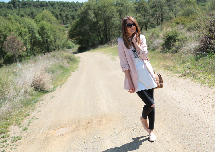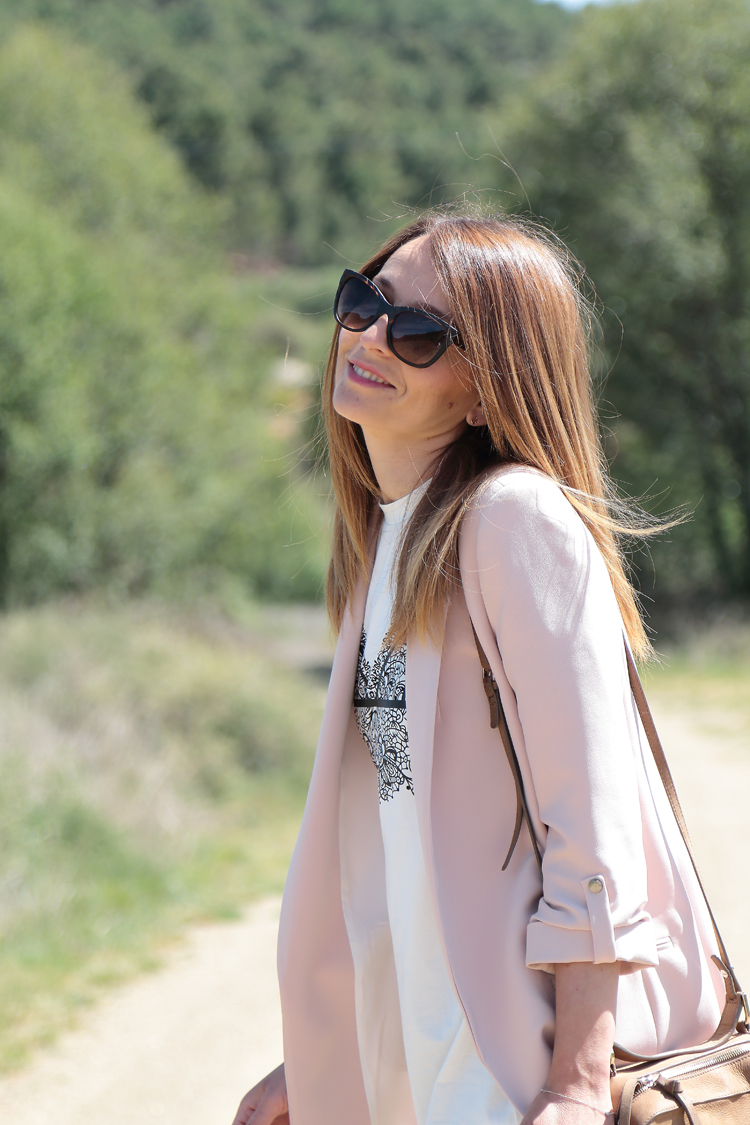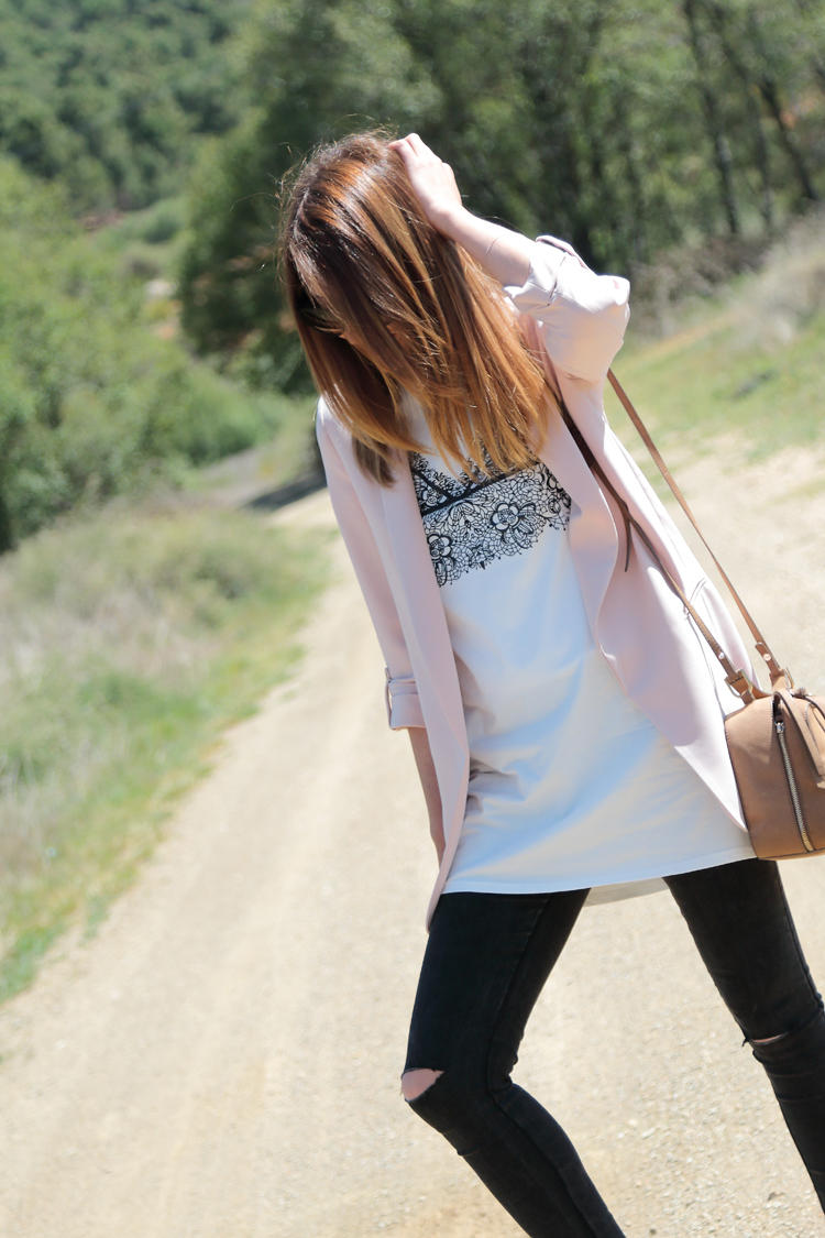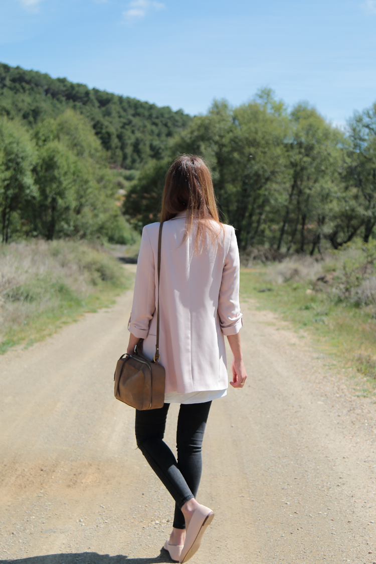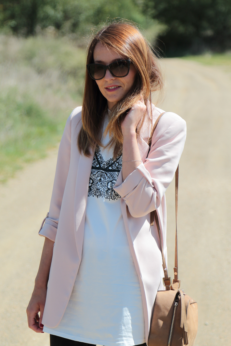 Hay looks que son una constante en mi vida como los protagonizados por la combinación blazer+ camiseta. Esta vez ambas prendas son de temporada así que si te gusta cualquiera de las dos puedes hacerte con ellas. La camiseta me hizo gracia porque a pesar de ser una camiseta blanca y larga de lo más normal el dibujo del pecho tiene su punto, un guiño divertido a esa moda de llevar la ropa interior por fuera.