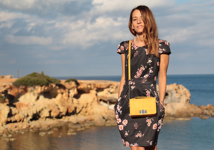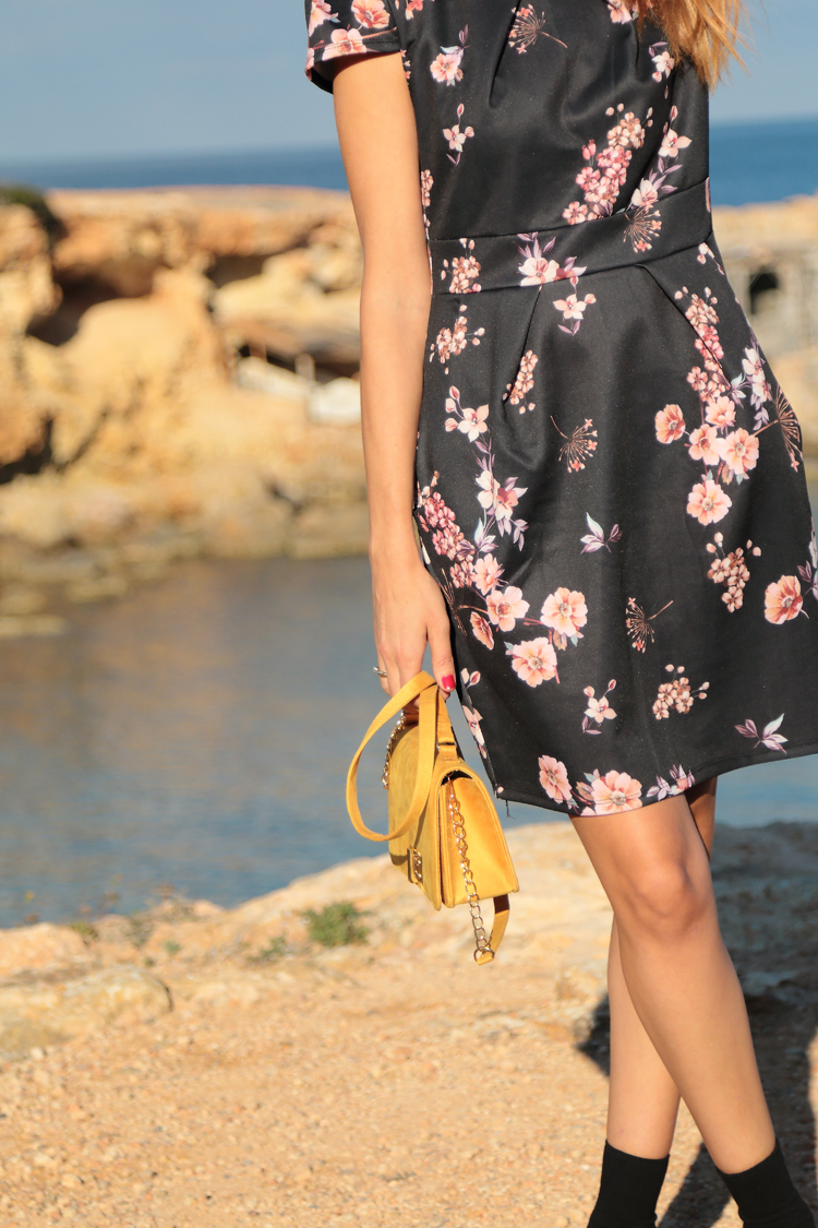Por lo demás es un vestido muy cómodo de llevar porque aunque define la figura no es ajustado. Lo he combinado con botines calcetín en tono negro  y un bolso color mostaza. Encima esta vez llevo uno de mis abrigos favoritos aunque me gusta más con cazadora decidí no llevar medias porque por el día las temperaturas andan por los 20 grados pero no quería arriesgarme a pasar frío al caer la tarde así que me decidí por el abrigo.
