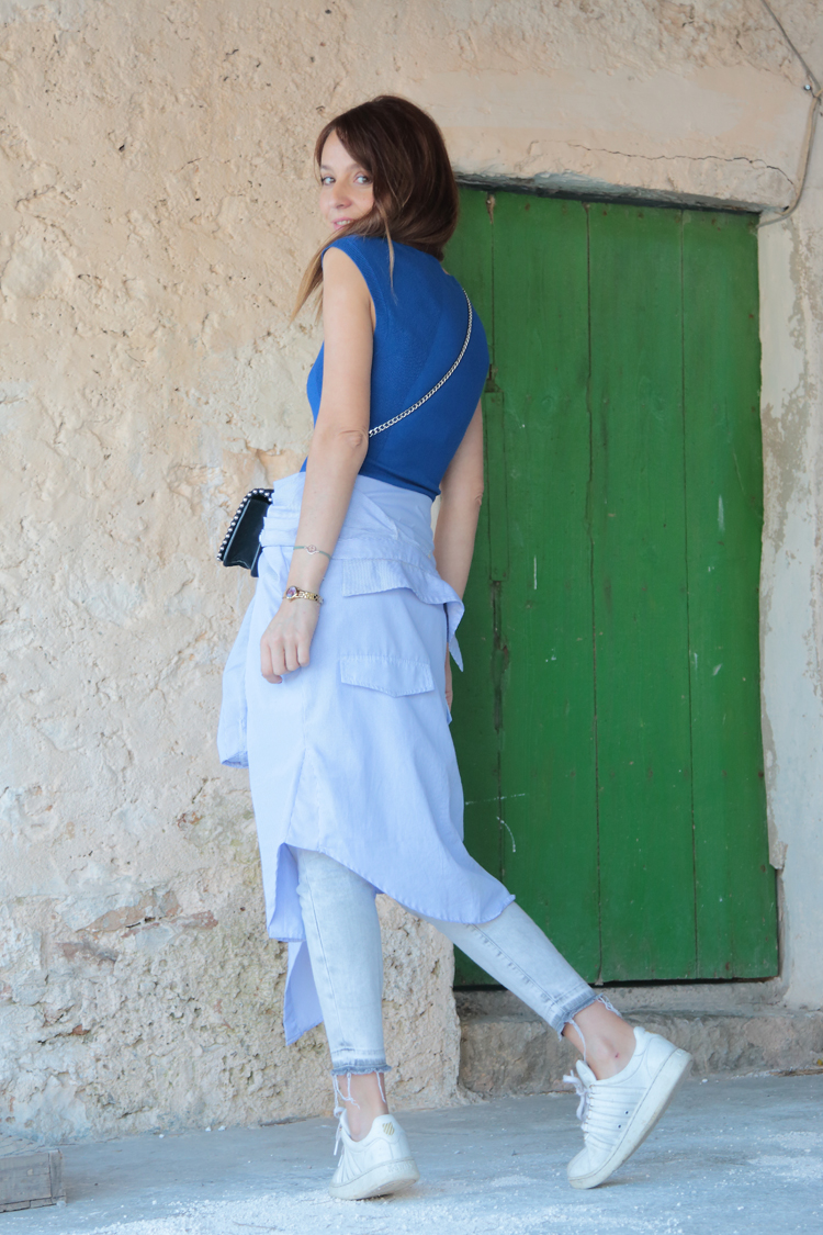 Un jersey pegadito debajo, vaqueros grises, zapatillas de deporte blancas y bolso azul marino completan el look. Un look cómodo para el fin de semana que aunque no tiene nada especial a mi me gusta mucho.