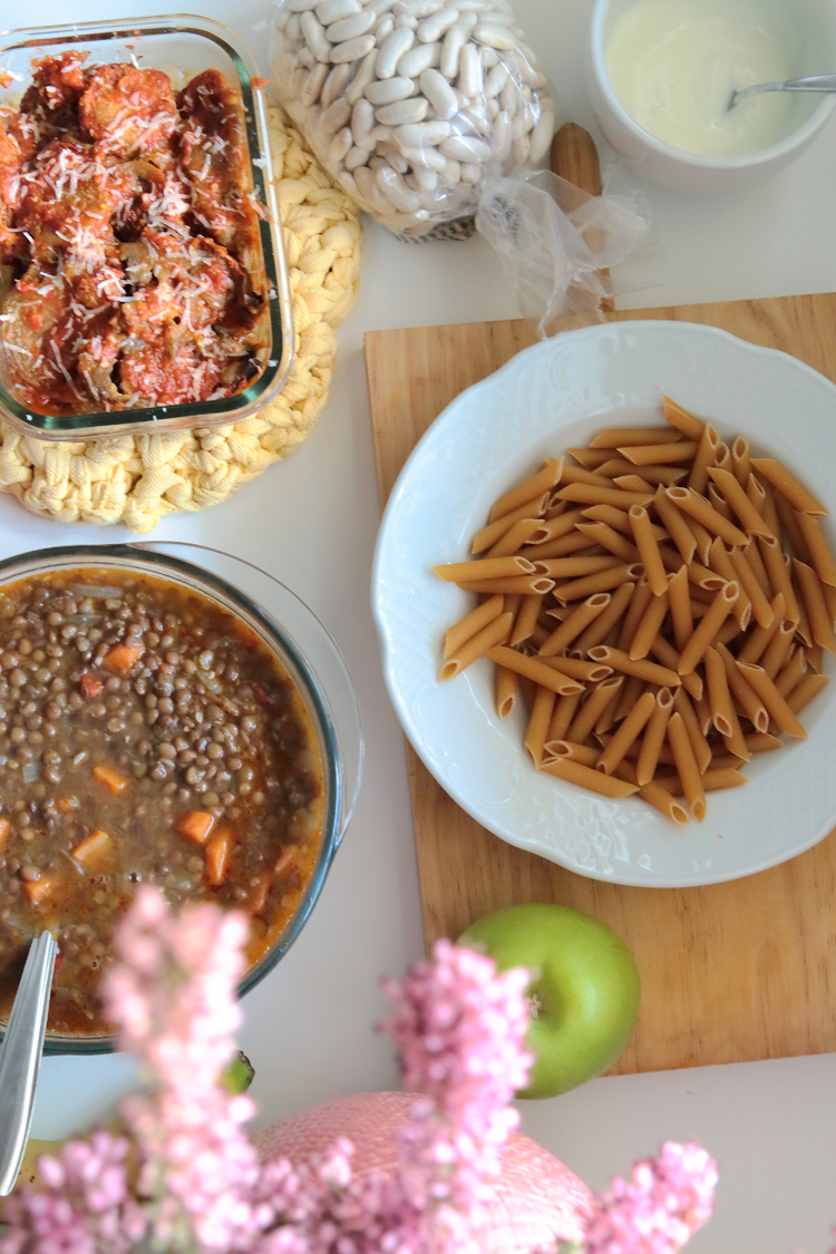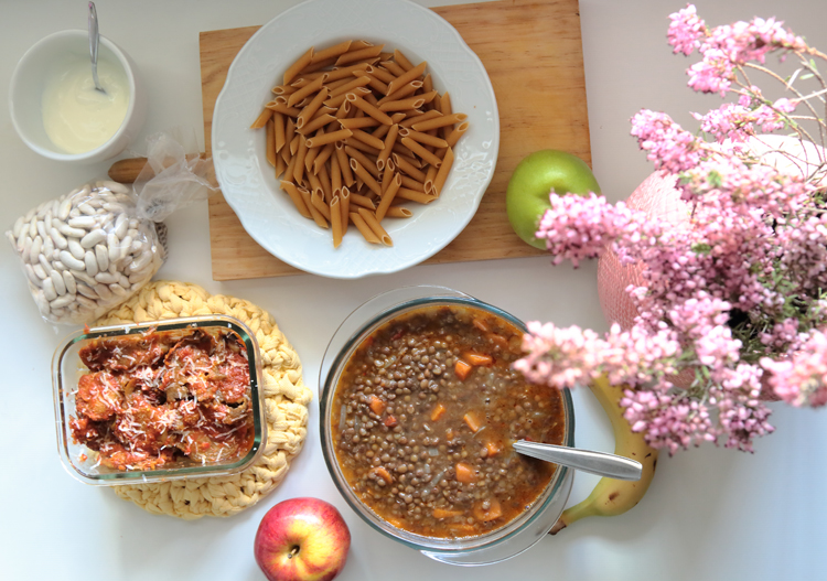 Como ves no es nada complicado, otras semanas en lugar de lentejas son garbanzos en lugar de «fabes asturianas» son alubias de la bañeza. Pollo asado en lugar de berenjenas y con el sobrante del pollo el vienes tenemos un arroz con pollo muy rico etc. con el sobrante de los garbanzos hacemos una ensalada también utilizando cous cous… Cada semana intento variar y hacer diferentes platos siempre con la misma ideas que la base de nuestra alimentación sean legumbres y verduras. Espero que pueda darte alguna idea para tu día a día, si te gusta este tipo de artículos otro día te cuento nuestras cenas. ¡Feliz lunes!