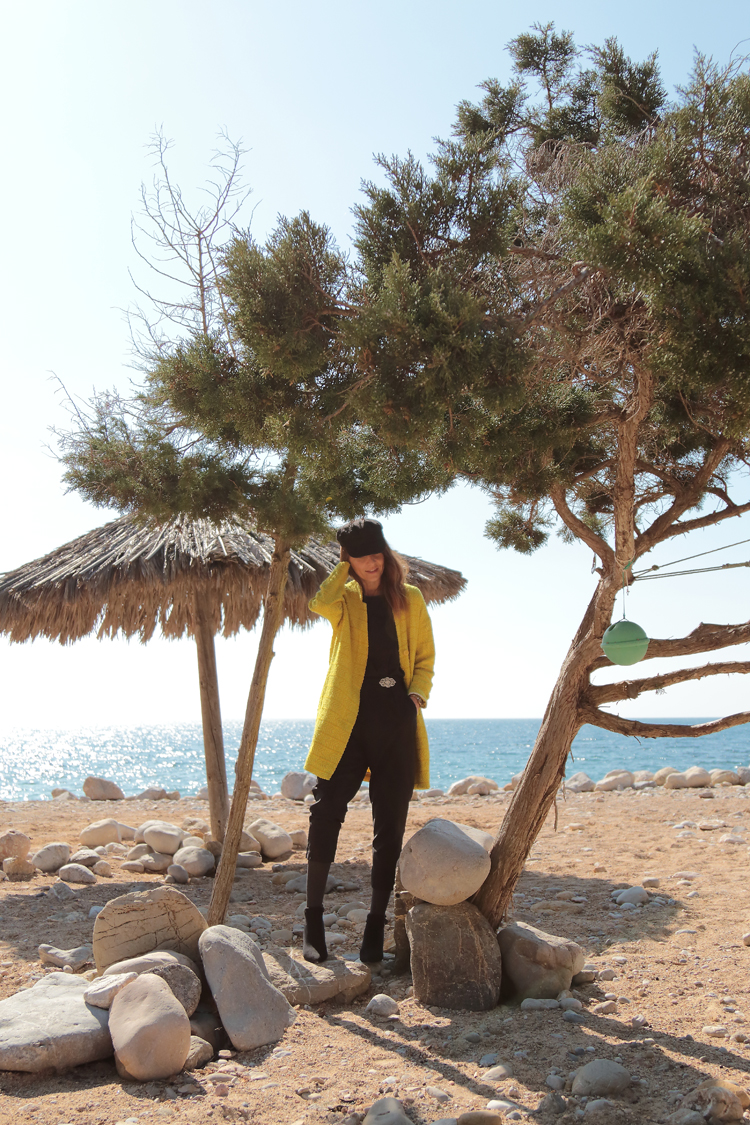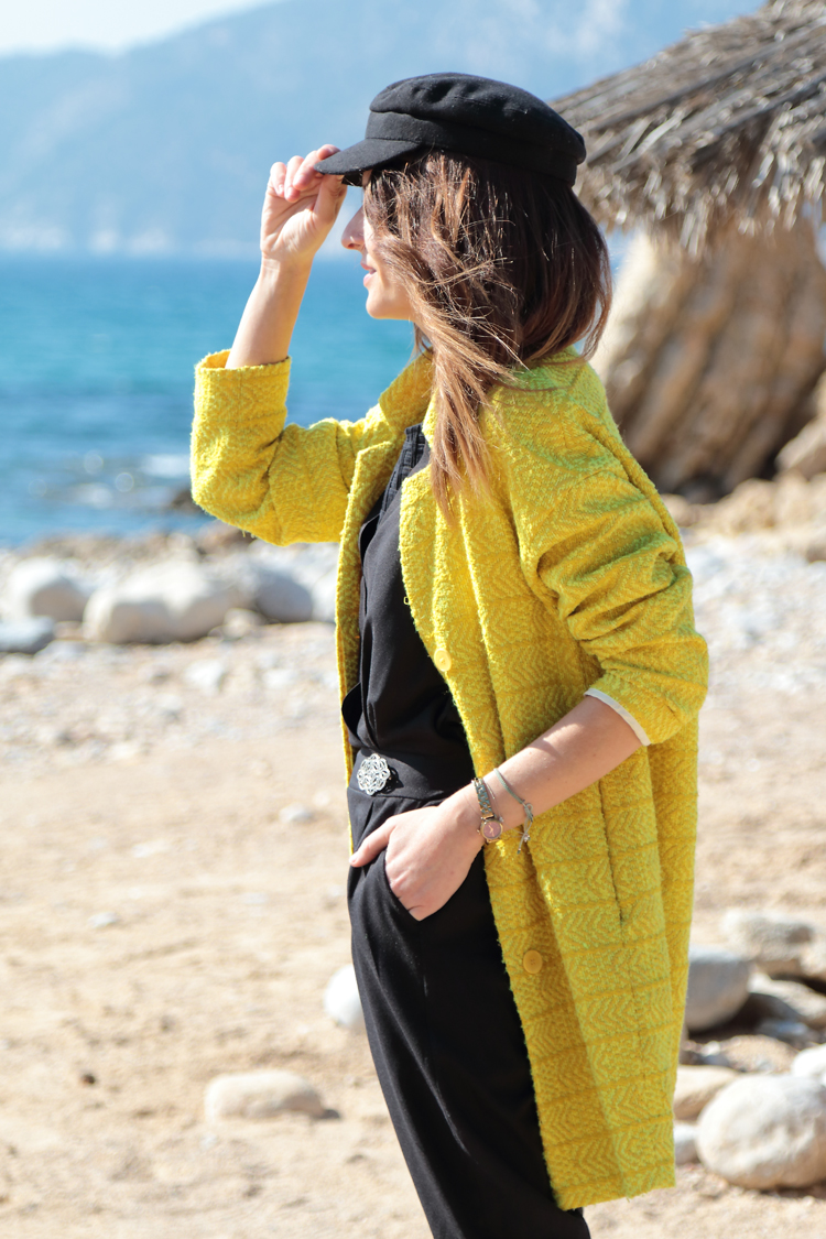 Abrigo y botines Zara, gorra Mango, jumpsuit Shein