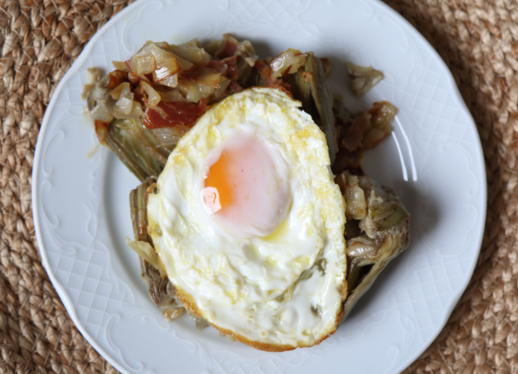 Una vez que tenemos las alcachofas limpias y cocidas, solamente tenemos que hacer un sofrito con un chorrito de aceite de oliva, media cebolla tierna, medio puerro y un ajo (todo picado finamente). Pasados unos minutos añadimos unos trozos de jamón serrano y por último añadimos 8 alcachofas y las dejamos hasta que se doren por ambos lados. Cuando estén doradas el plato está listo, solo tenemos que emplatar y poner sobre ellas un huevo frito por comensal ¡Deliciosas!