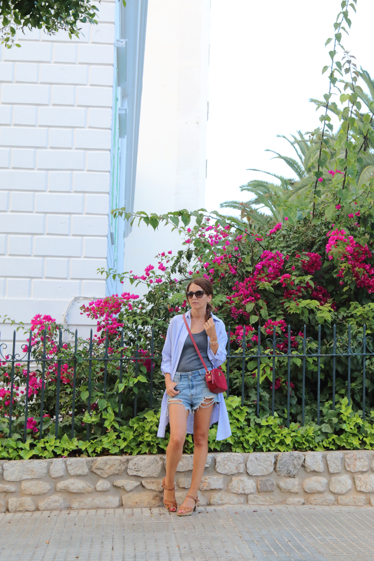 En el look de esta semana son protagonista dos de las prendas que forman parte desde hace unos años de los básicos de mi armario: mis shorts favoritos y esta camisa oversize que lo mismo utilizo para ir a trabajar combinada con pantalón de vestir que en looks totalmente casual como el de hoy. Y es que no te engaño cuando te digo que en los últimos tres meses apenas he comprado nada: estas sandalias planas, el bikini que he sacado en Instagram y una camiseta blanca, esas han sido mis únicas compras este verano.