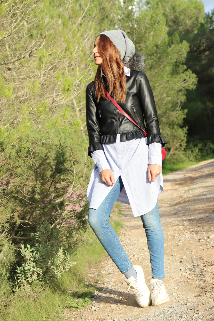 Pantalón y chaqueta Zara, camisa Shein, Bolso Parföis, Gorro Headict, Zapatillas K-Swiss