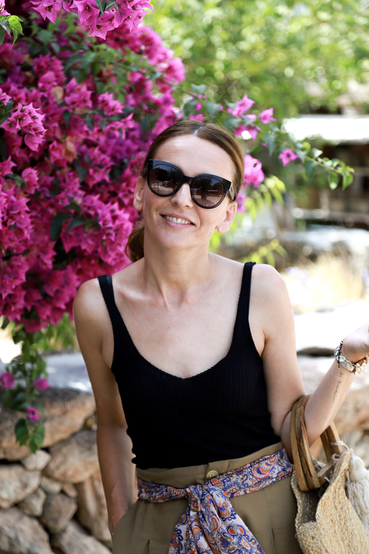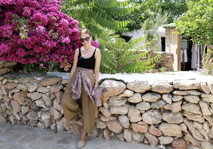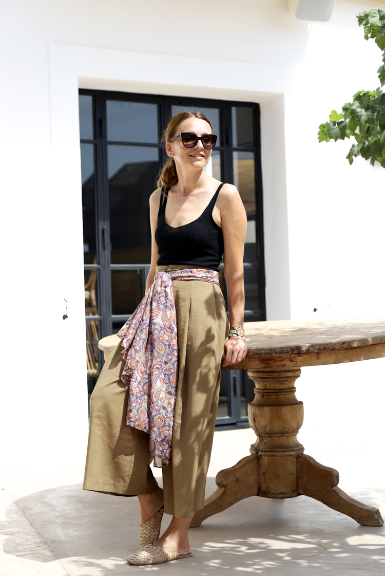 Pantalón Zara, top Stradivarius, pañuelo H&M Mules Eseoese vía Sal de Ibiza The Store