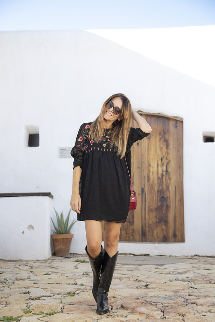 El vestido que llevo hoy es otro de los más utilizados de mi armario. Al igual que el vestido color maquillaje que te enseñaba la semana pasada, este modelo también me lo he puesto un montón de veces. Pero como las combinaciones no son lo suficientemente variadas pues no ha aparecido tantas veces por aquí. Quizás me lo has visto más en fotos improvisadas de Instagram. Normalmente lo he llevado con cazadora vaquera, con cazadora de cuero y hoy con una blazer básica negra. Me encanta el tejido estilo plumeti, el bordado de flores y que aunque para mi es bastante cortito como el forro termina en pantalón corto siempre estoy muy cómoda utilizándolo.