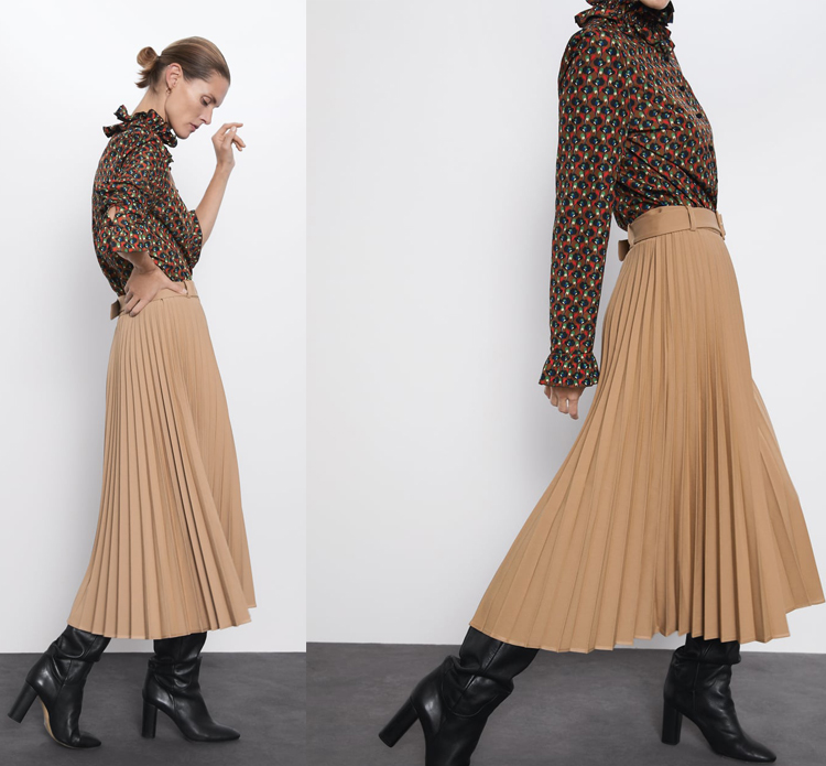 Look 5: Falda Midi + jersey +botas camperas. Este look es otro de mis habituales, no solo eso esta falda que ahora ponen de nueva temporada y que es preciosa la probé el pasado otoño y estuve a punto de comprarla hasta que recordé que con mi vestido podía conseguir un efecto parecido. Sin embargo sin en mi armario no estuviera el vestido esta sería una de mis compras segura. Una pena que no la hayan puesto de rebajas, pero desde mi punto de vista es una buena inversión. Con ella lograrás hacer un montón de looks de trabajo cómodos y bonitos.