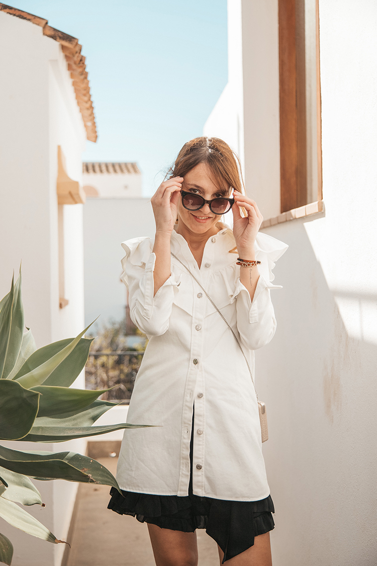 El vestido de hoy es regalo de cumple de mi hermana, con lo que si te gusta podrás encontrarlo fácilmente. Para mi más que un vestido es una camisa larga, así que en esta ocasión lo he combinado con la falda negra de volantes que te he enseñado en varios looks. Un recurso muy sencillo para cuando los vestidos son algo cortos. Hoy te lo enseño en la versión de calle con botas camperas y en la versión de playa como la última vez. Si consigo mantenerlo blanco lavado tras lavado, estoy segura que será una de mis prendas favoritas porque me parece monísimo, gracias al volante.