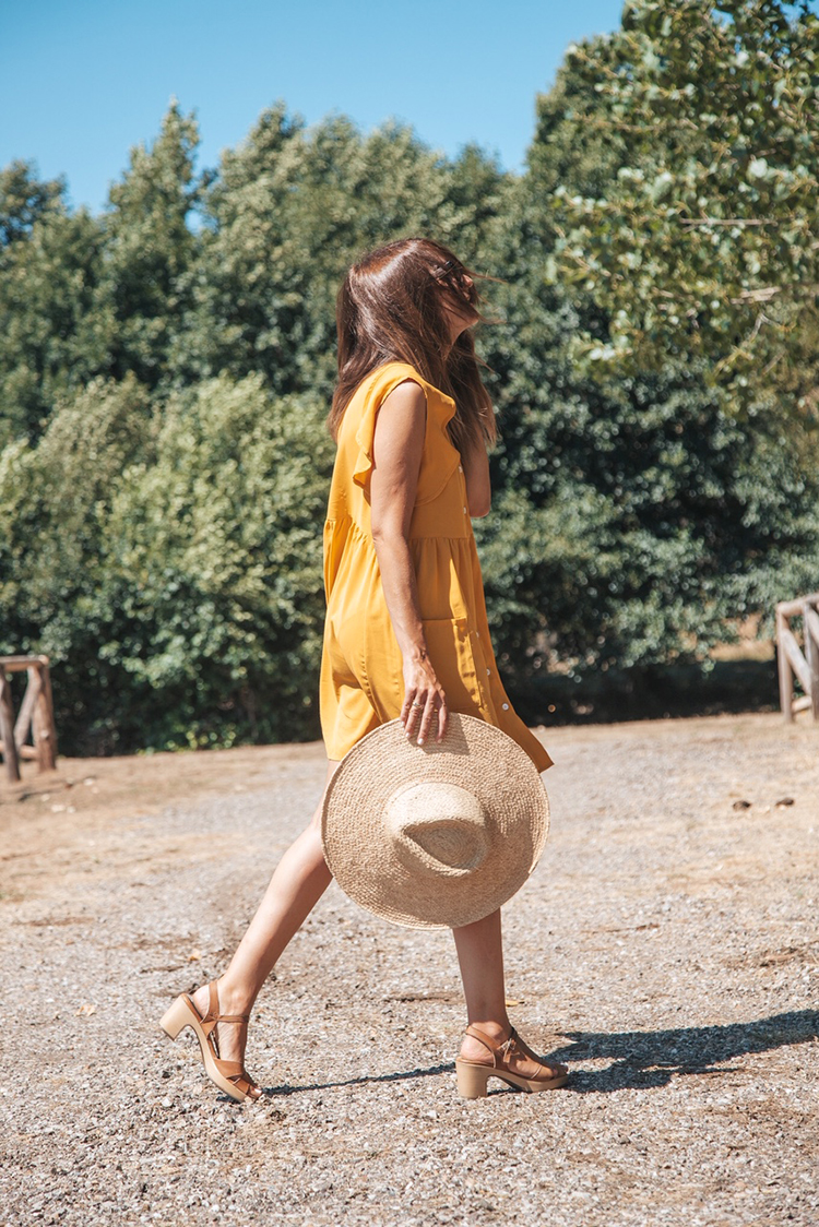 Vestido mostaza Shein Sandalias Wonders, Bolso y Sombrero Sal de Ibiza The Store