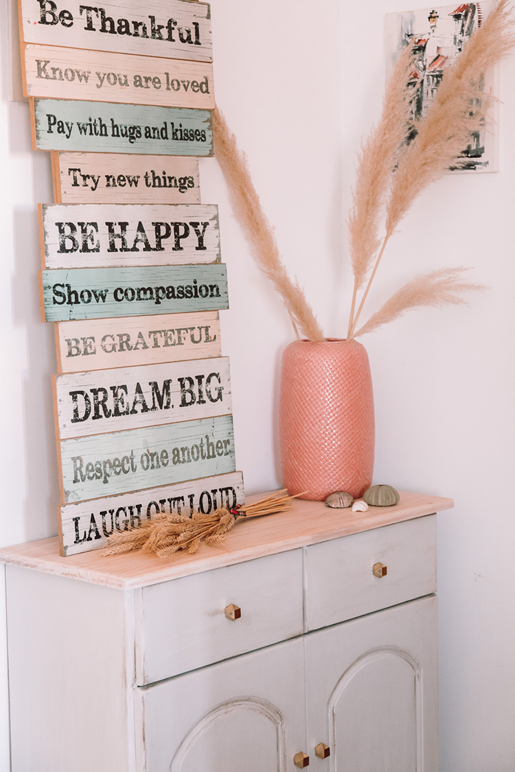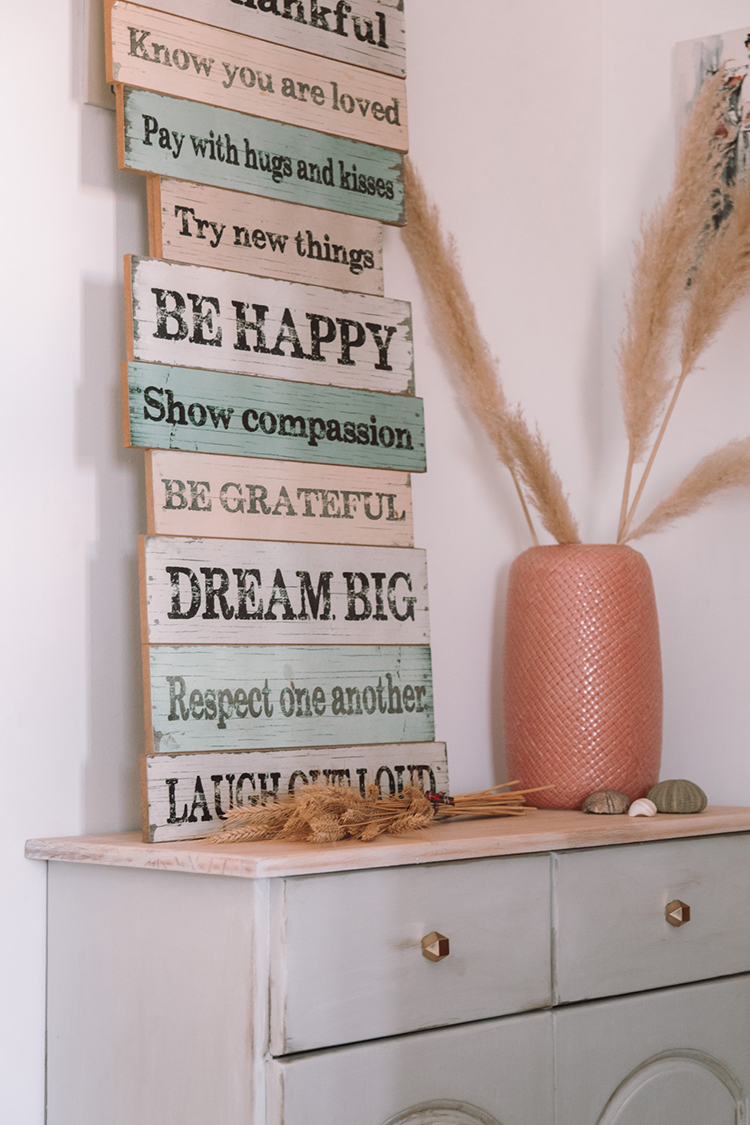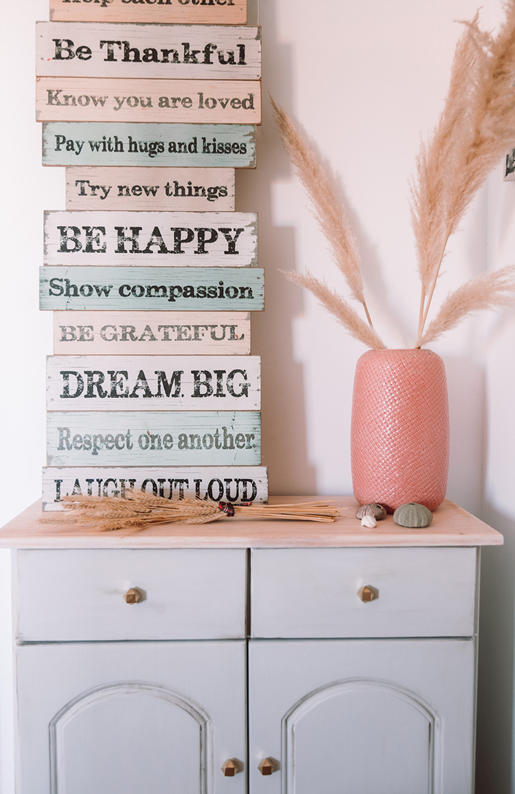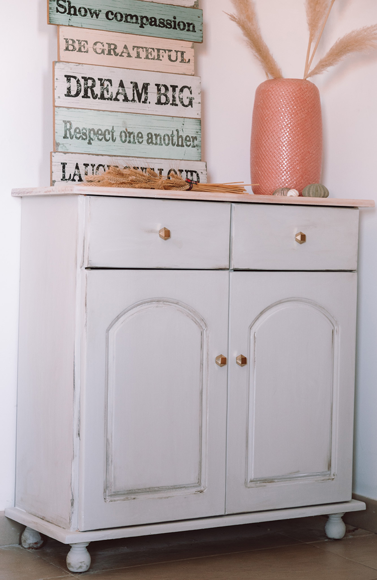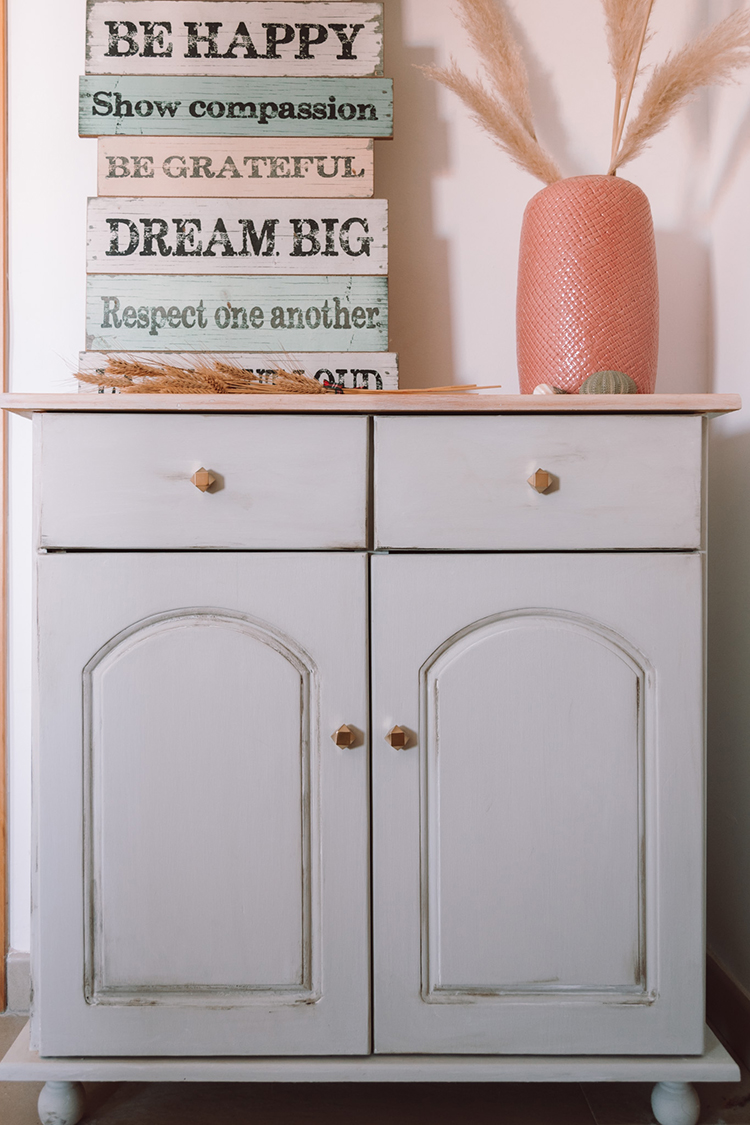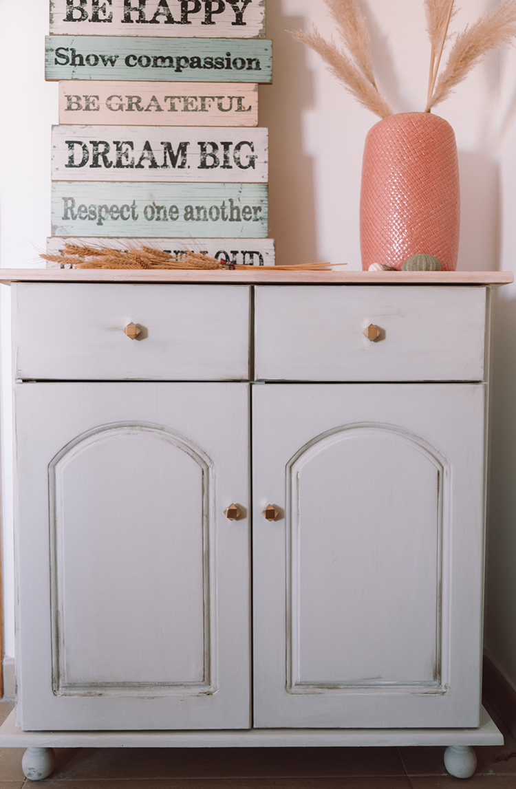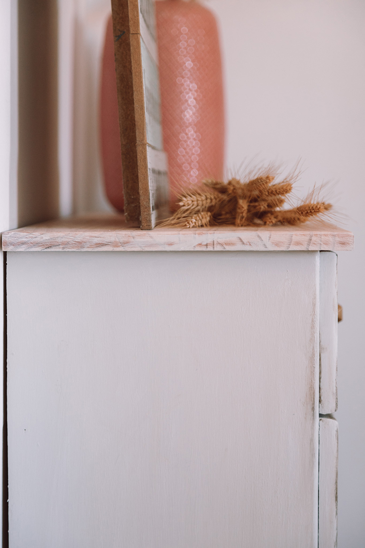 5. Llega el momento de utilizar la cera. En este caso he utilizado cera transparente y blanca para la parte de arriba que dejé sin pintar. Cera blanca y brown para el resto. La cera sirve para proteger el mueble y a la vez en función de la tonalidad que utilicemos le da un acabado u otro. A mi me ayudó mucho a visualizar lo que quería conseguir y a no tener miedo a utilizar las ceras este vídeo de Crea, Decora y Recicla No quería que el mueble quedara con aspecto super envejecido pero si que tuviera un punto de mueble vivido y creo que lo he conseguido. En zonas concretas del mueble apliqué con pincel la cera brown y en el resto la cera blanca con un trapo de algodón.