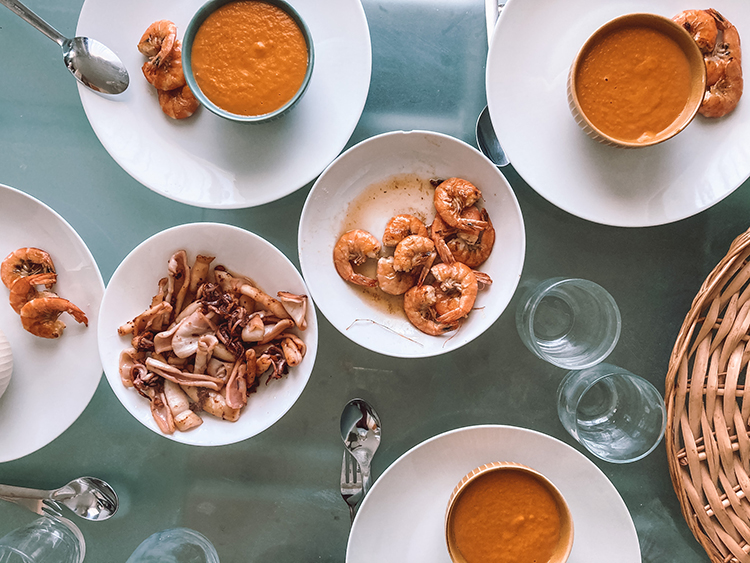- Hacemos a la plancha los langostinos a los que hemos quitado las cabezas y servimos junto a la crema de verduras.