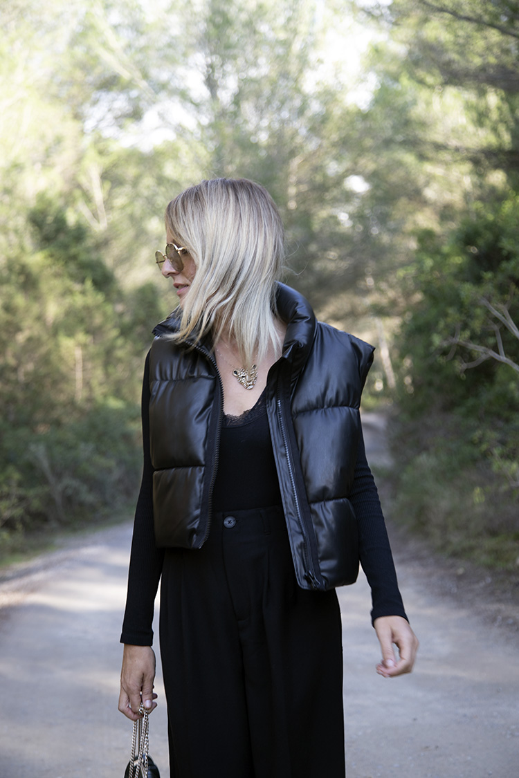 En el look de hoy te enseño algunas de mis últimas compras: chaleco acolchado, pantalones estilo traje y la camiseta que es en realidad un body. No me cabe duda que el body es la compra que más voy a amortizar. Como suelo hacer es la versión de esta temporada de uno que compré en 2019 y que puedes ver en este look Este año no superó el cambio de armario porque estaba súper gastado. Así que lo he remplazado por una versión de manga larga y con un tejido más gustoso.