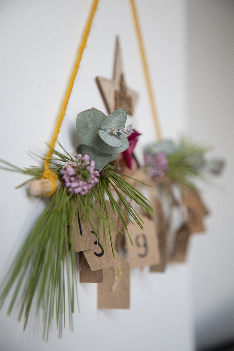 Un palo, tarjetas (las hicimos el año del calendario de las estrellas con un cortador para aprovechar el papel craft y las hemos utilizado este año) Plantilla de números (puedes hacerlos a mano alzada pero desde mi punto de vista quedan más bonitos con plantilla) Cuerda para atar las tarjetas al palo. Pegamento de pistola para pegar la cuerda a las tarjetas. Ramas de pino, eucalipto y flores secas (nosotras brezo y Hortesia) Un adorno navideño.