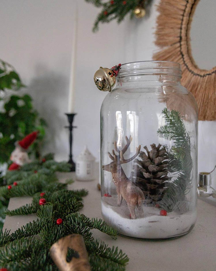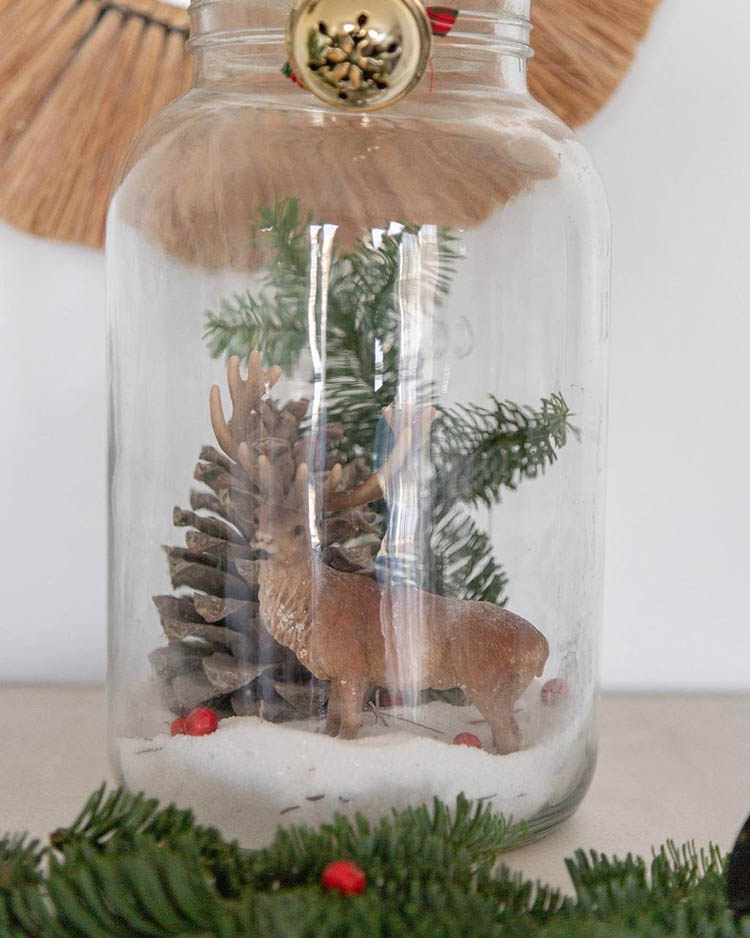 Aunque utilice prácticamente las mismas cosas, para mi es la más bonita de los últimos años. Me da sensación de hogar. Este año he hecho un paisaje en tarro con una piña, un reno, sal y una ramita de pino. El reno era un juguete de mi hijo mayor de hace muchos años. ¡Felices Fiestas!