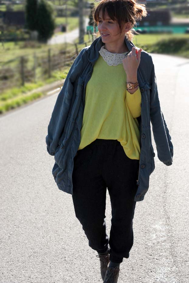 Los pantalones estilo chandal que ya os enseñé hace unas semanas combinados de otro modo, esta vez con el jersey amarillo fluor y botines con suela de goma de hace varias temporadas. Los botines hacía un montón que no los ponía y definitivamente ya no me encuentro a esa altura a no ser que el zapato lleve plataforma interior.