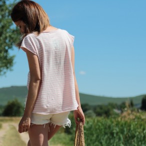 Shorts blancos y camiseta de rayas rosa