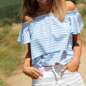 Blusa con volantes azul cielo y blanco